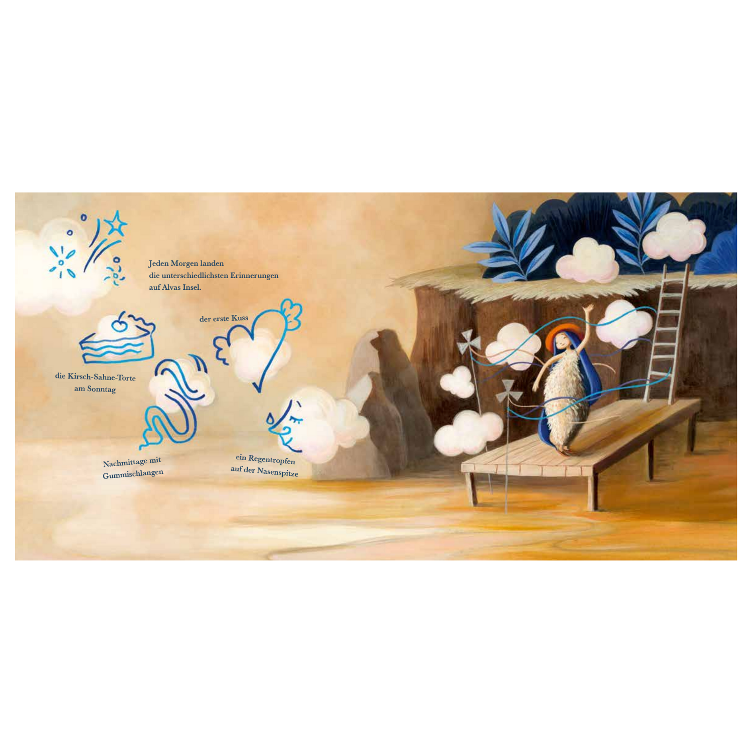 Alva lebt allein auf einer Insel. Jeden Tag kommen bei ihr Erinnerungen an, um die sie sich kümmert. Sie putzt und poliert sie, damit sie nicht verblassen. Doch eines Tages ist etwas anders. Haben die Menschen etwas das Erinnern verlernt? Alva macht sich auf den Weg in die Stadt und hört dort herzergreifende Geschichten von unwiderstehlichen Kirsch-Sahne-Torten, ersten Küssen und Gummischlangen ...
